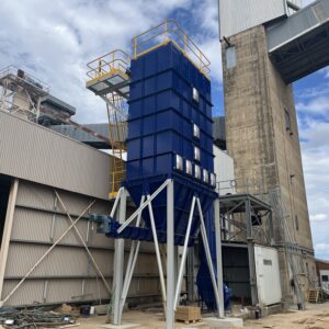 - Baghouse: PA120 × 4000 unit with welded 6 mm mild steel housing and heavy-duty tube sheet, using anti-static polyester filter bags with snap cuff attachments and rigid cages.