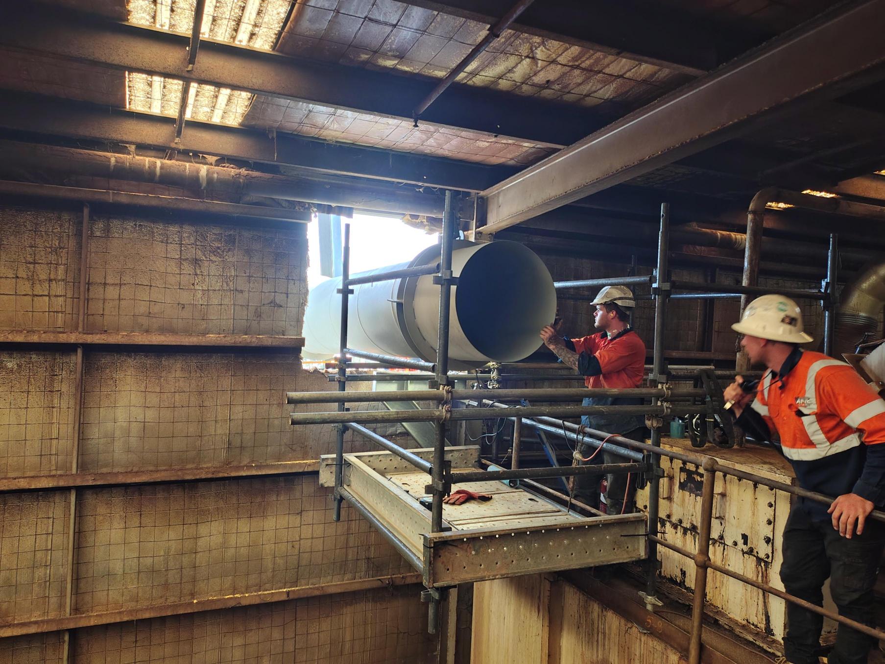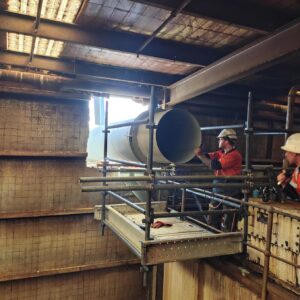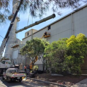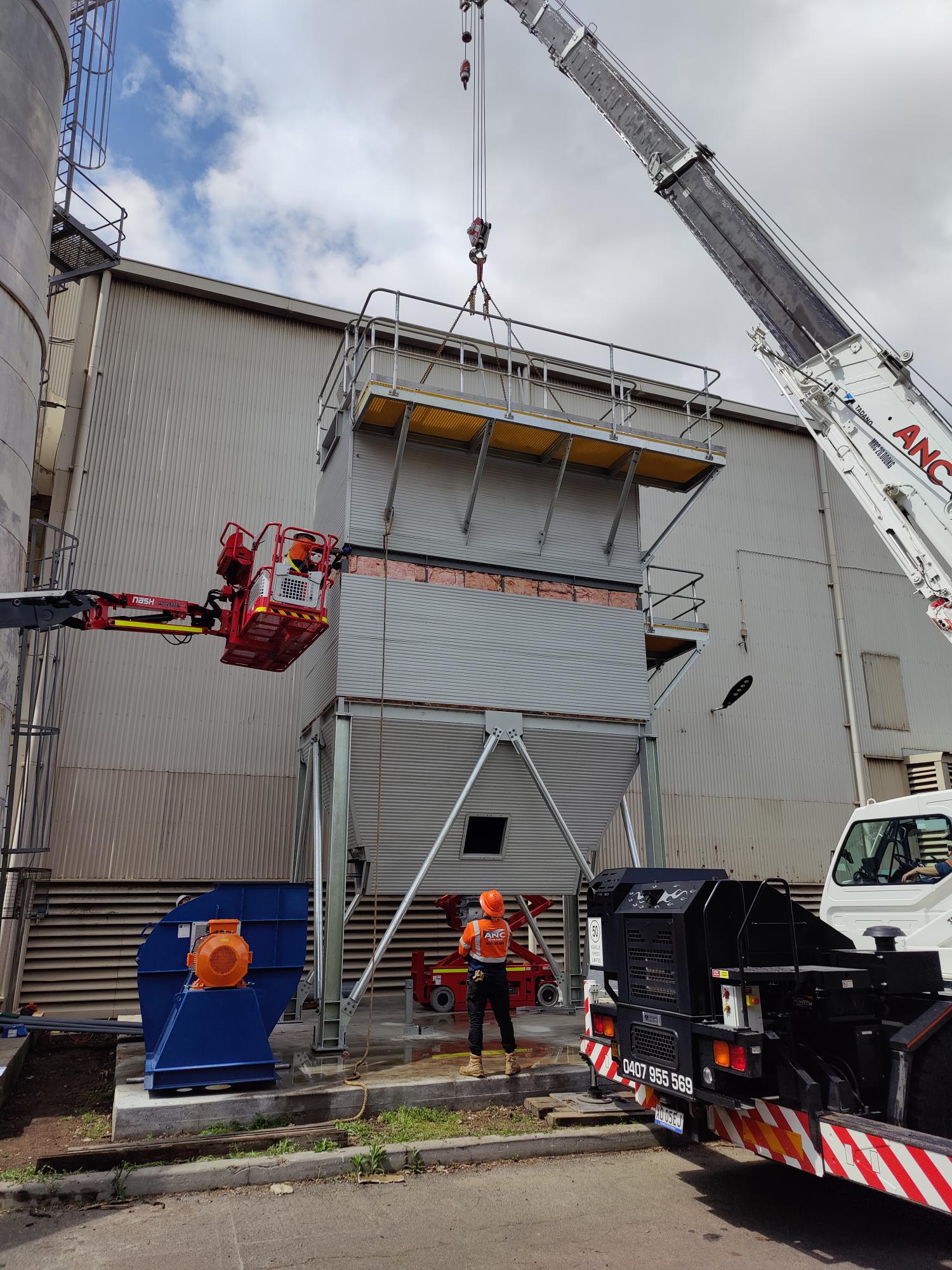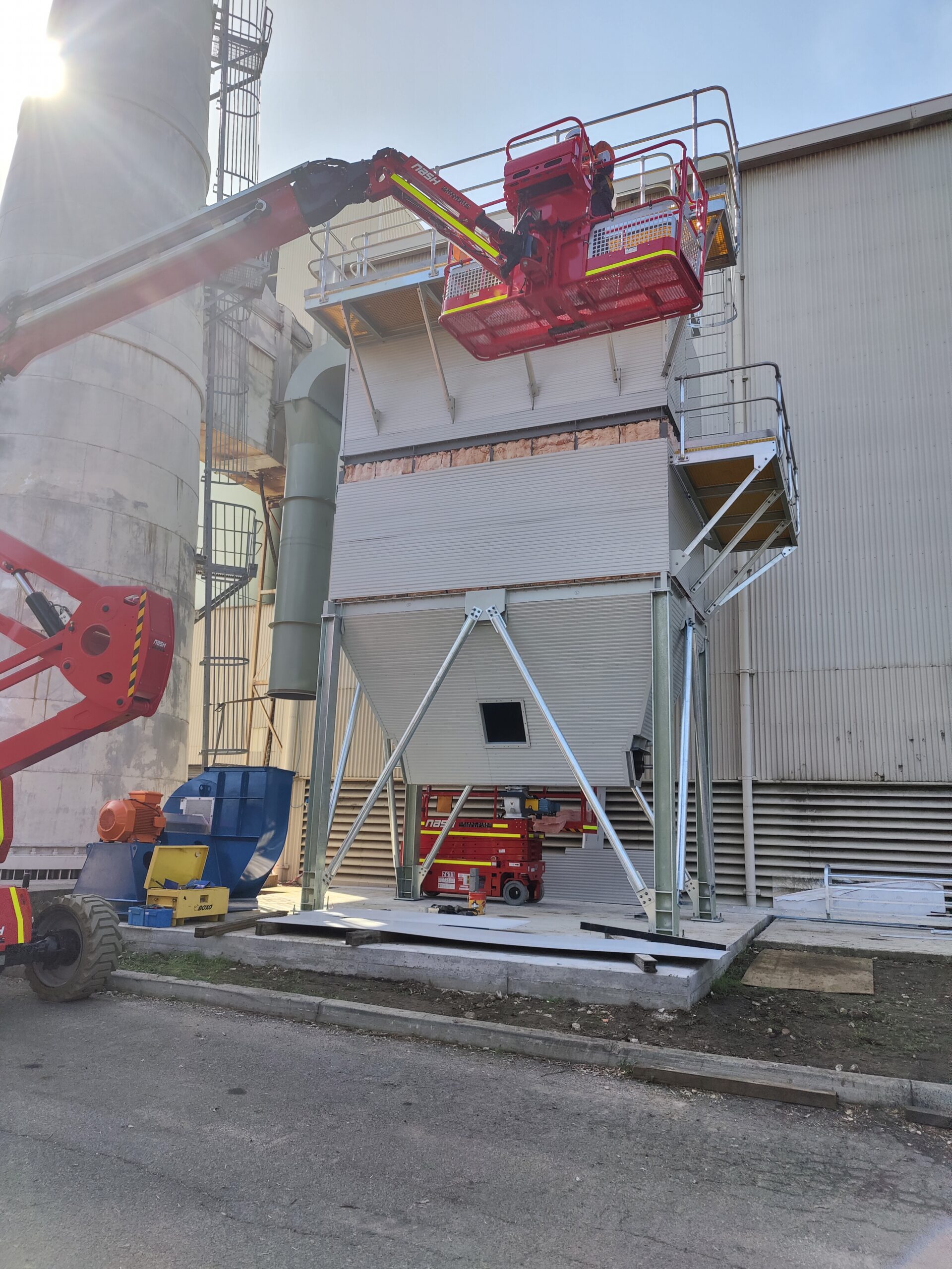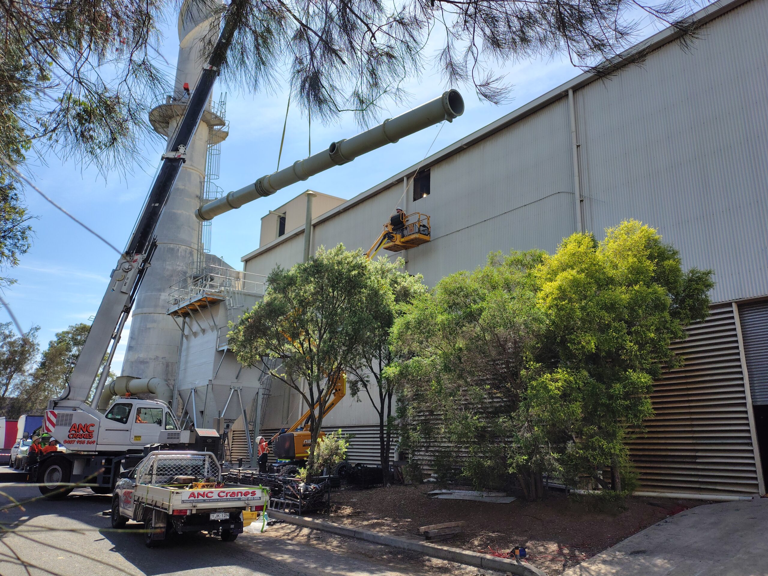 Ducting installation presented unique challenges, as it required transporting and assembling large duct sections across the upper section of an operational factory to reach the connection point on the existing furnace stack.